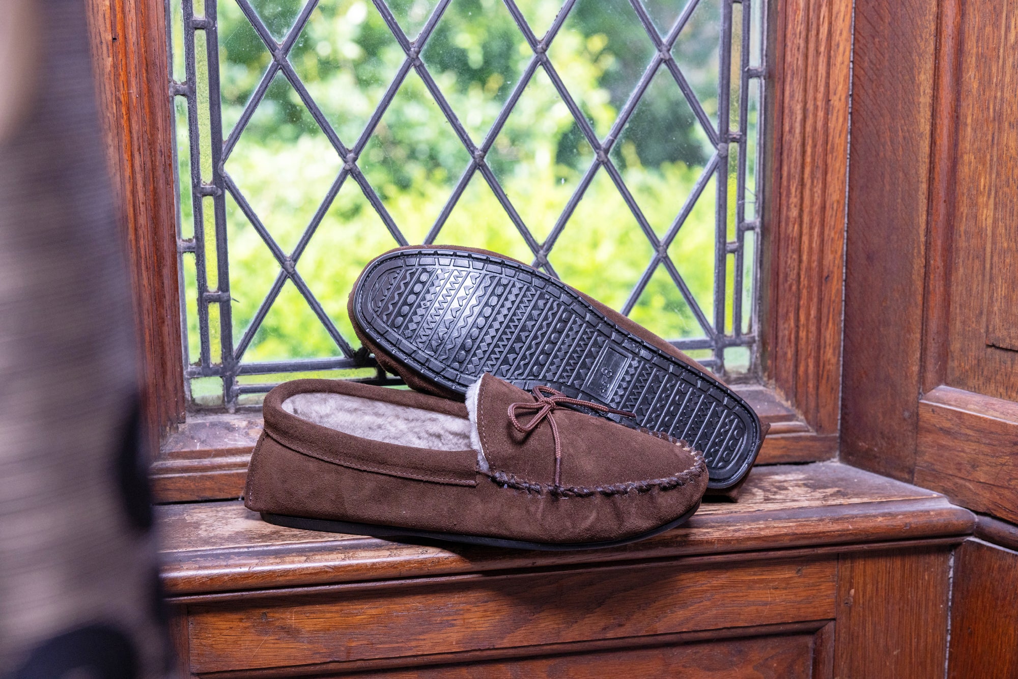 Our men's sheepskin moccasin slipper with a hard sole. It has a suede upper, real sheepskin lining and a very flexible rubber sole for indoor and outdoor use. Made in England.