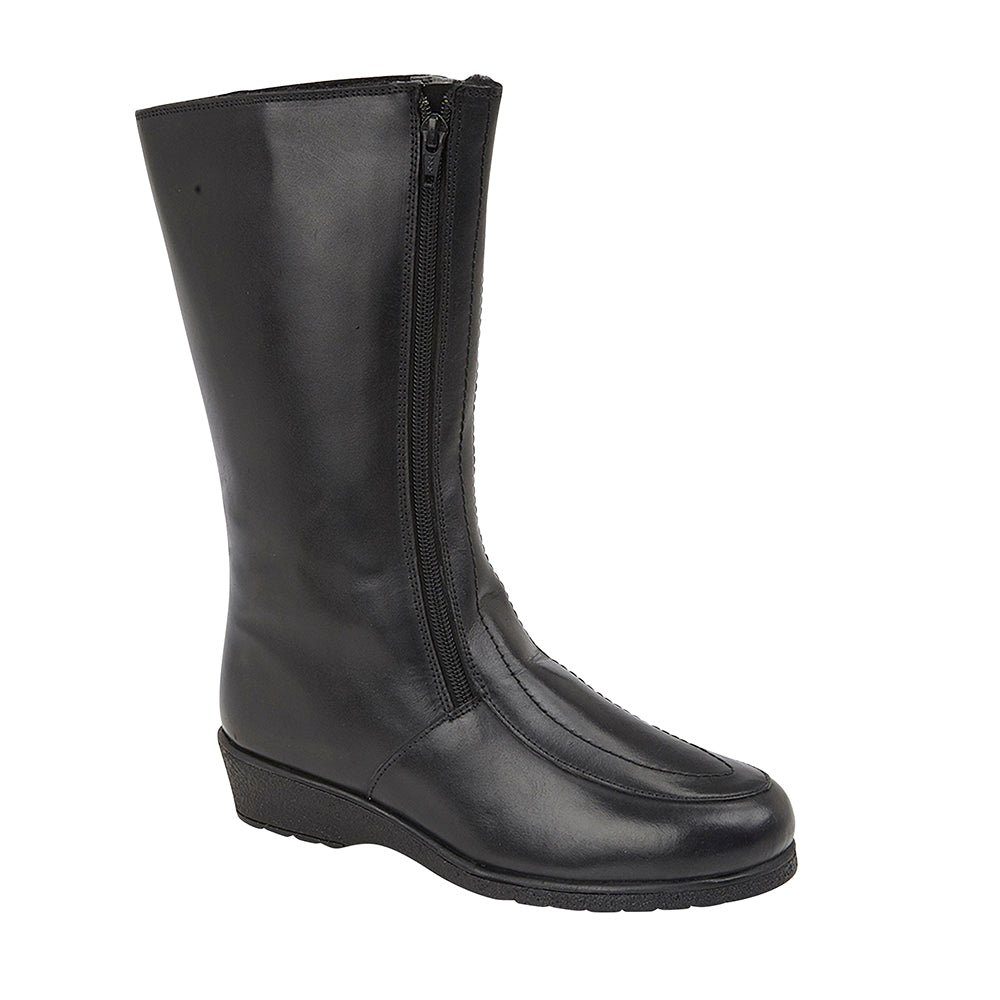New and improved with a real sheepskin lining. The leather version of our traditional twin-zip rubber sole ladies boots for easy fitting. These handmade sheepskin ladies boots have leather uppers and 100% sheepskin lining, non-slip rubber soles with 1½ inch heels. The leg height is 11 inches. E fitting (wide). The top of leg circumference is 16 inches.
